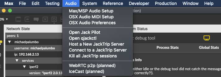 The audio menu provides direct access to several OSX utilites, Jack, and JackTrip.