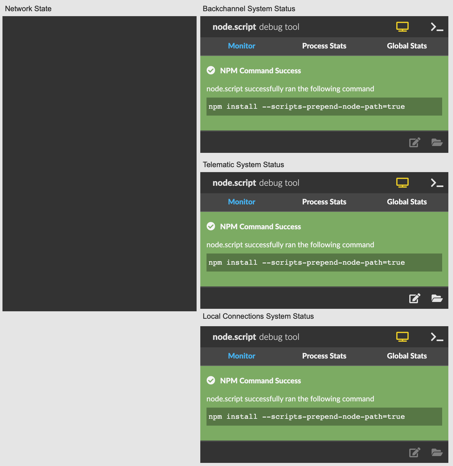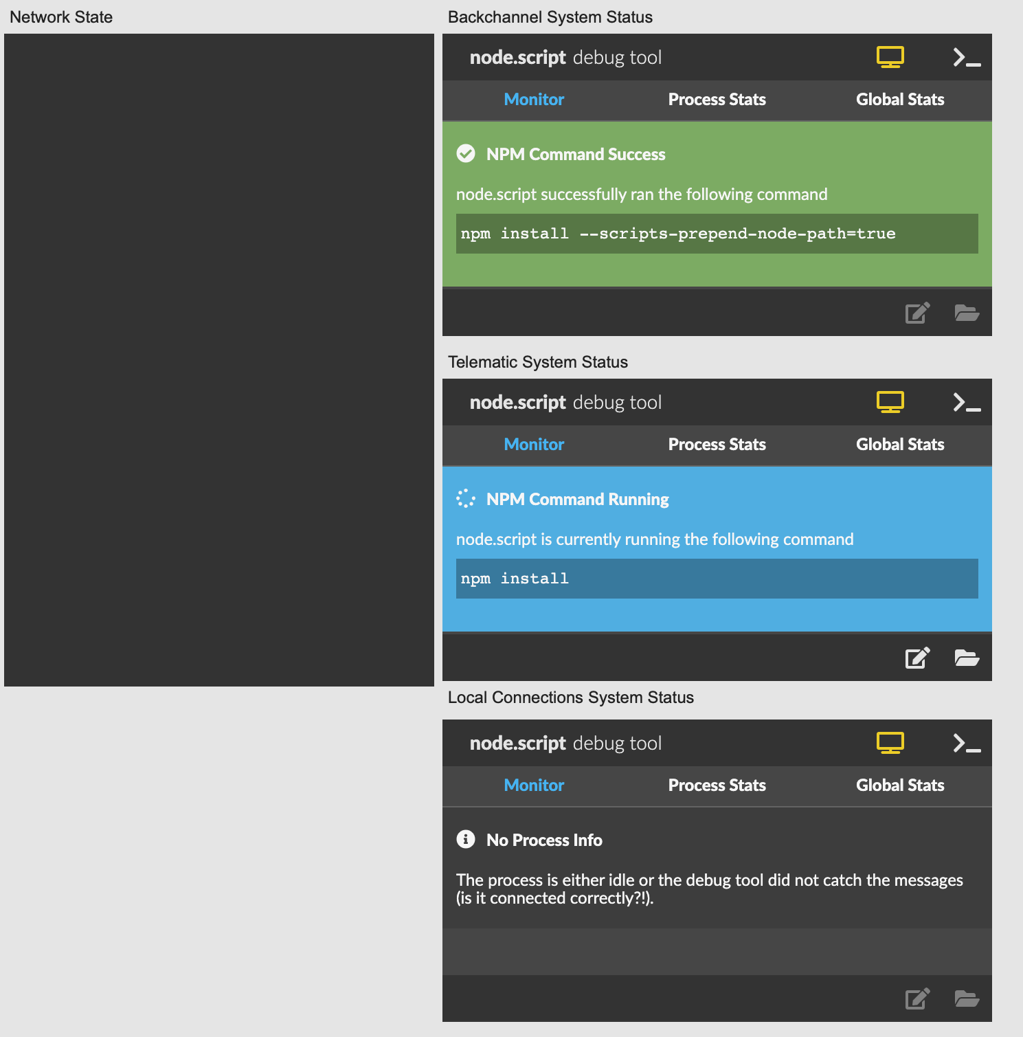 In the menubar, navigate to System > Install Disperf which will install the dependencies for Disperf. This may take a while, but you can observe the progress by watching the three system status windows. Each will turn blue one at a time during the install: