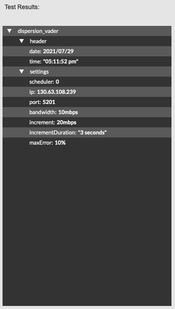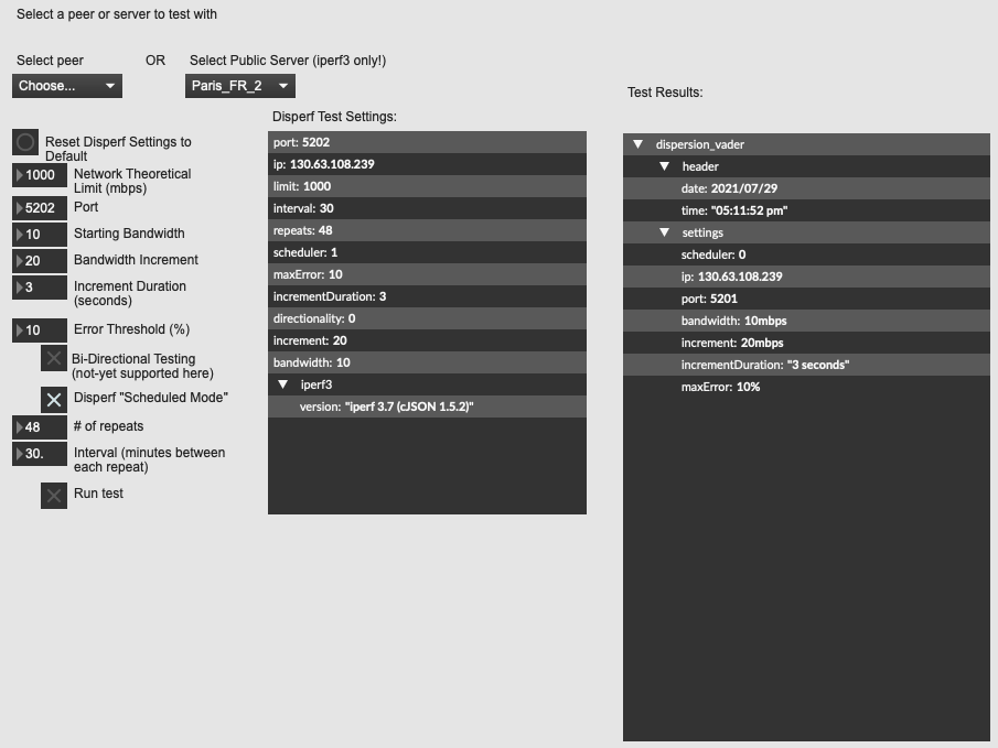 Scheduled Mode: with this feature enabled, an incremental test will be performed for a set amount of times ever nn minutes. In the Dispersion Lab, we would use this to capture network conditions between collaborators over the course of a week, for example.