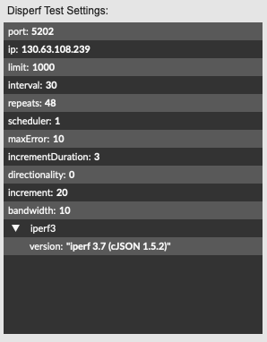 The Disperf test window allows you to run several useful bandwidth tests tests between your node and another on the network. The test will begin with an initial minimum bandwidth, and iterate subsequent tests of increasing bandwidth, returning packet loss, jitter, and other metrics at each interval. The test will end if either the loss threshold is met, or if the bandwidth increment reaches the theoretical limit.