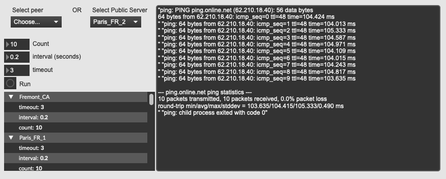 The latency test window provides a ping test interface between your node and any of the connected peers, or between your node and a publicly hosted iperf server.